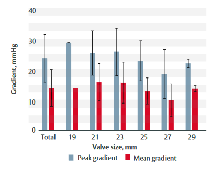 Figure 1: Peak and mean gradients at 3-year follow-up for each valve size