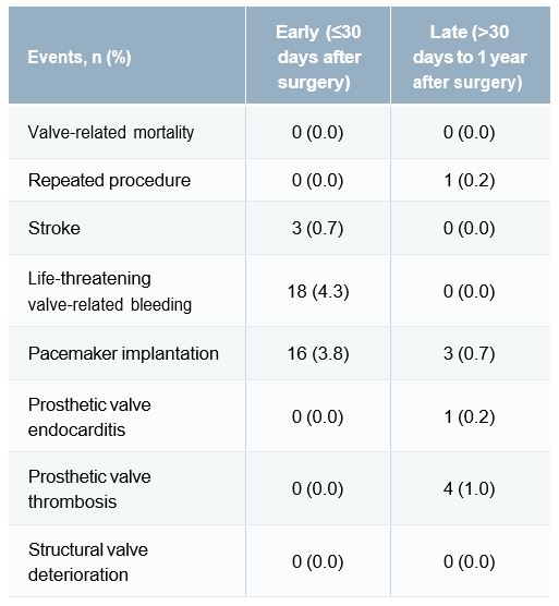 Endpoints included time-related valve safety according to VARC-2 guidelines and haemodynamic performance at 1 year and changes in QoL from baseline to 1 year.