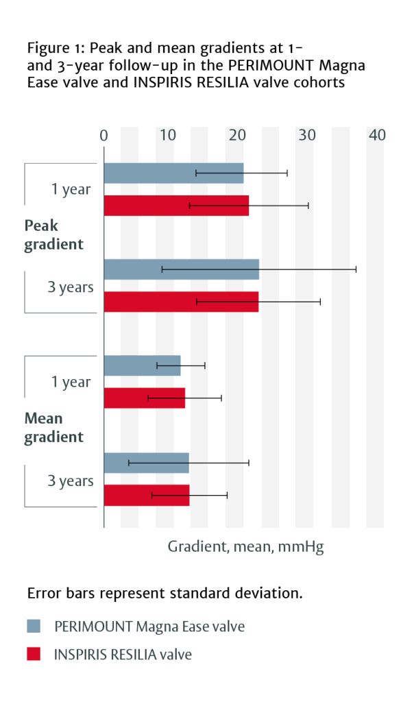 - PERIMOUNT Magna Ease valve and INSPIRIS RESILIA valve showed similar haemodynamic performance at 1-year and 3-year follow-up in terms of peak and mean gradient (Figure 1) and left ventricular volumes and diameters.