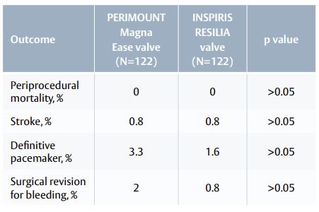- Periprocedural outcomes were similar and not statistically significant between INSPIRIS RESILIA and PERIMOUNT Magna Ease valves.