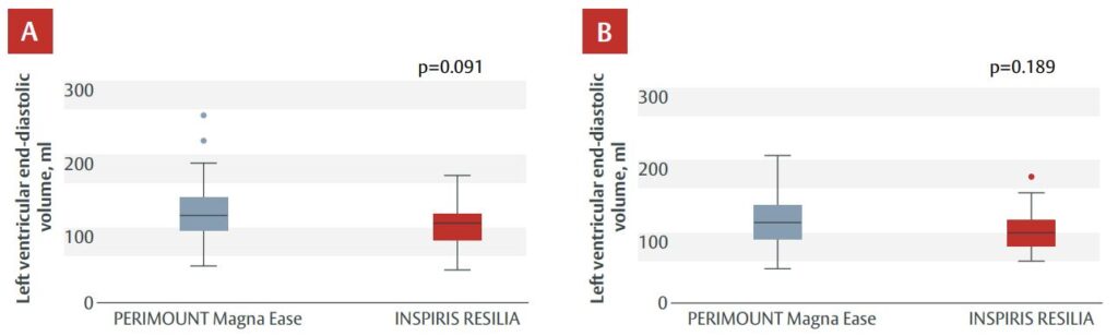 - At 1 and 3 years, the differences in mean pressure gradient, Vmax or LVEDV (Figure 1) with the INSPIRIS RESILIA valve vs the Magna Ease valve did not reach statistical significance. Mean gradients and peak velocity was also similar between groups across different valve sizes (19–21 mm, 23–25 mm and 27–29 mm).
